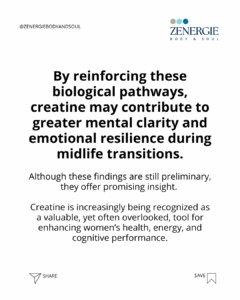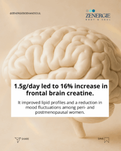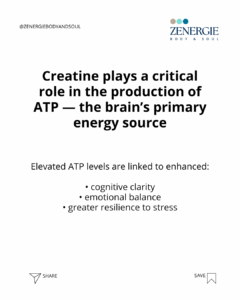 During menopause, hormonal changes can reduce baseline levels of brain creatine and impact mitochondrial energy production. Creatine plays a central role in ATP synthesis — the brain’s primary energy source. Higher ATP availability is linked to mental clarity, resilience to stress, and emotional stability.